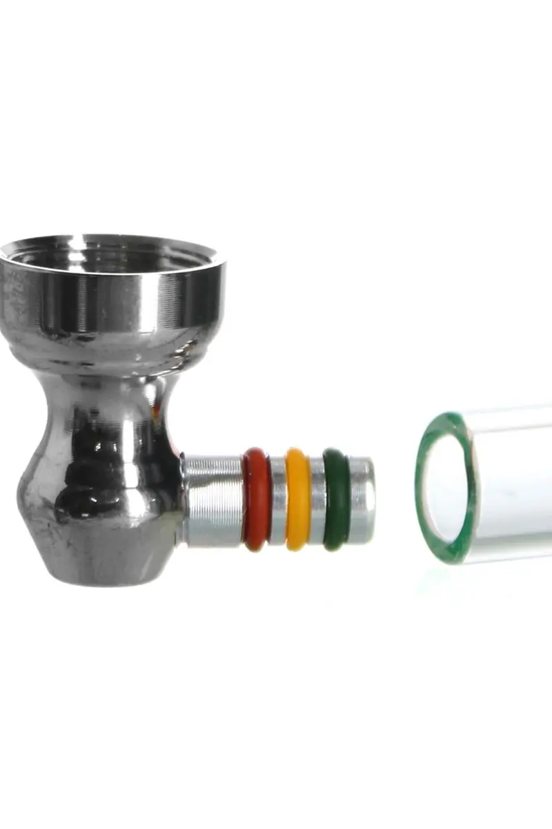 Inclui um bowl metálico removível com grelha integrada, que garante uma boa filtragem e facilita a limpeza. A ligação entre o tubo e o bowl tem três anéis de vedação nas cores Rasta (vermelho, amarelo e verde), que reforçam o visual característico da peça.