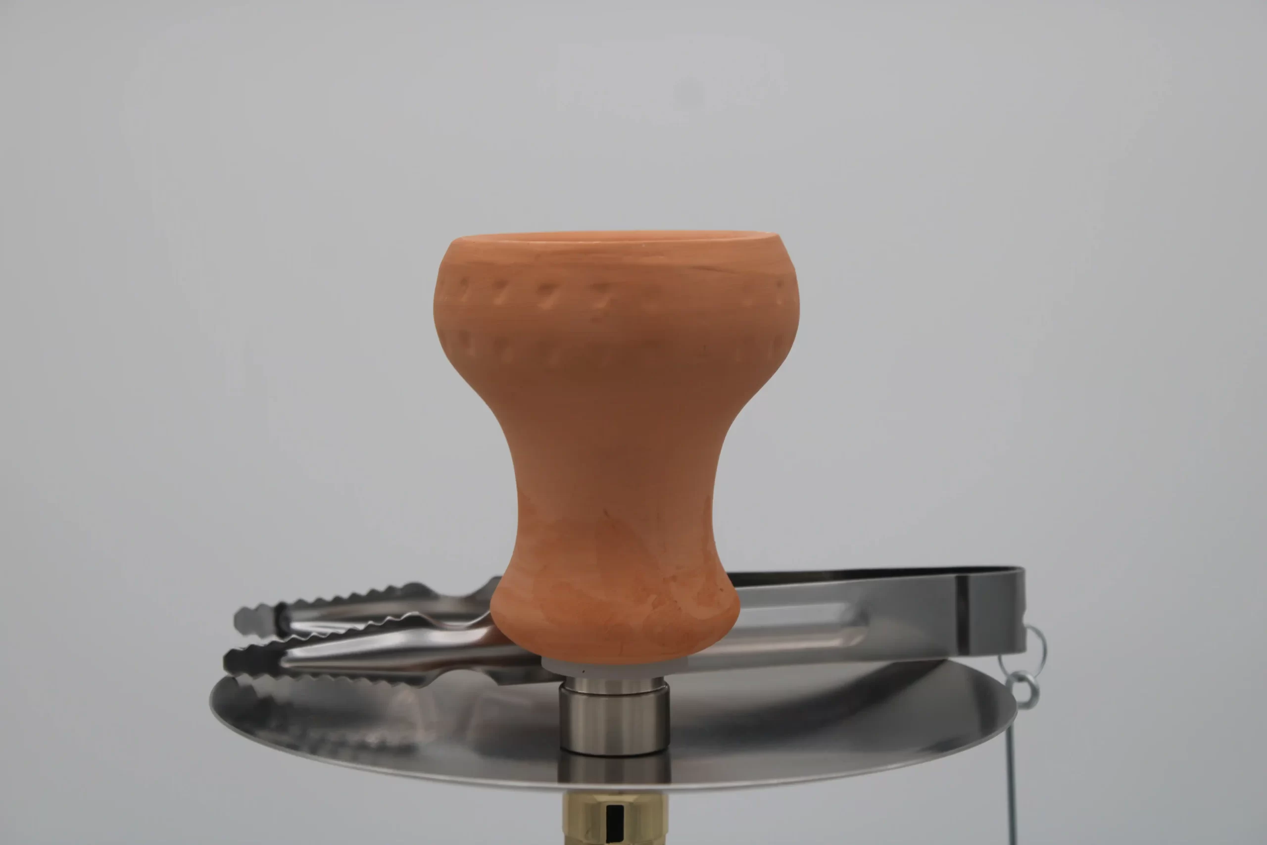 O vaso em vidro transparente valoriza o design e oferece estabilidade durante a utilização. A coluna com acabamento dourado confere um aspecto moderno e premium. O kit inclui cabeçote de barro, mangueira de silicone com bocal, difusor para uma sessão mais silenciosa e suave e pinça para manuseamento do carvão. Tudo pensado para que possa ser utilizada de imediato, sem necessidade de adquirir acessórios adicionais.