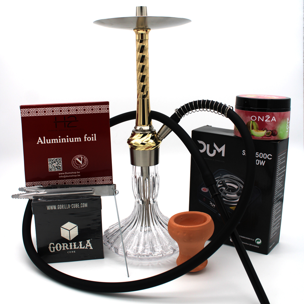 Pack completo GOLDWAVE Hookah com tudo incluído para começar a sessão de imediato. Inclui forno DUM 500W, carvão Gorilla Cube, essência ONZA sem nicotina e folhas de alumínio H2. O cliente deve indicar nas notas da encomenda a cor da shisha (Gold ou Rose Gold) e o sabor da essência ONZA; caso não indique, o envio é feito de forma aleatória conforme stock. Promoção Black Friday por 79,90 €. Consulte a informação completa no campo de descrição mais abaixo.